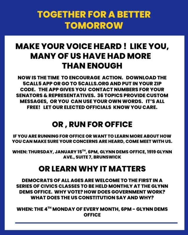 We are looking for Volunteers to help at the Glynn Dems Office. We will be needing phone bankers, and greeters. Please click this link to see Office Volunteer opportunities.